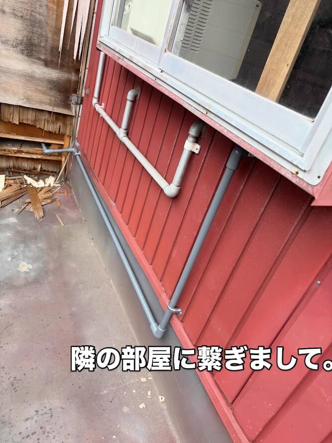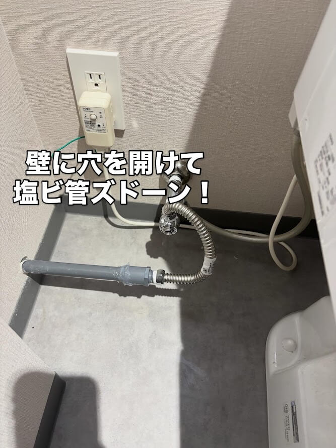 トイレの水道管の脇の壁に穴をあけて、塩ビ管通して隣の部屋までつなぐ。