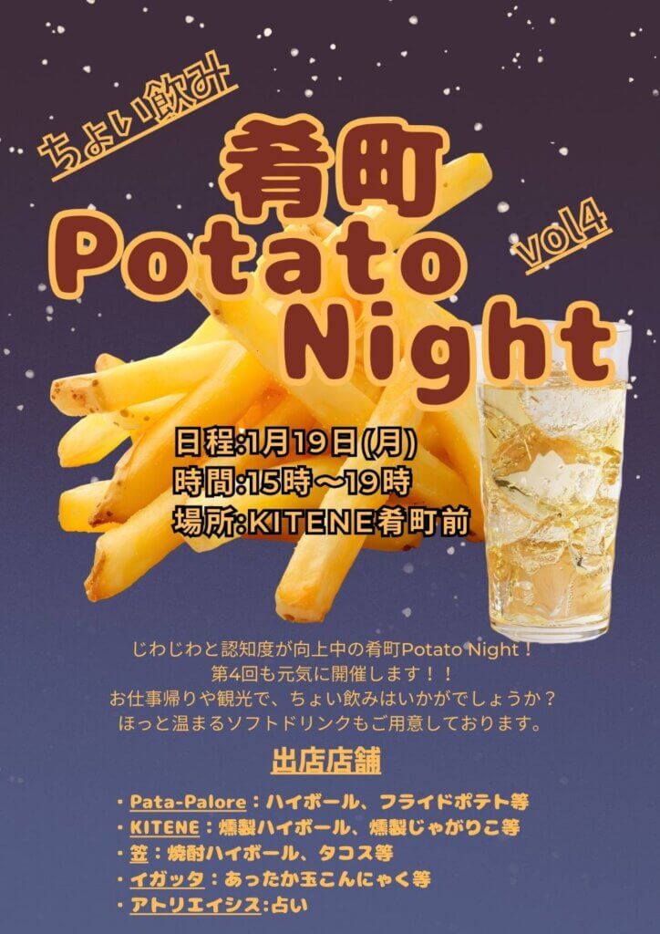 第4回「ポテトナイト」は1月19日(月) 15時よりKITENE前にて開催いたします! 1週間の始まりから元気に「おいしいもの食べて、おいしい酒を飲もう!」 そんなイベントとなっておりますので、ご来店お待ちしておりますっ […]